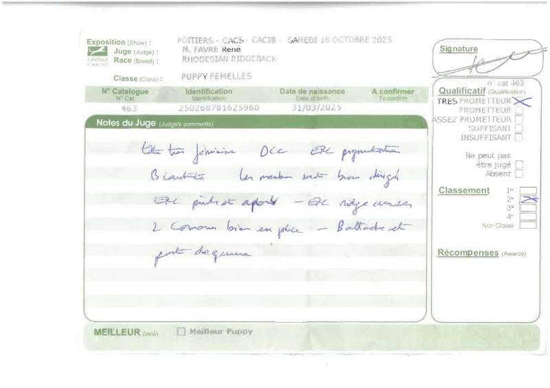 Tête très féminine, DCC, bien construite, excellente pigmentation, les membres sont bien dirigés, excellents pieds et aplombs, excellent ridge avec ses 2 couronnes bien en place, bonne attache et port de queue